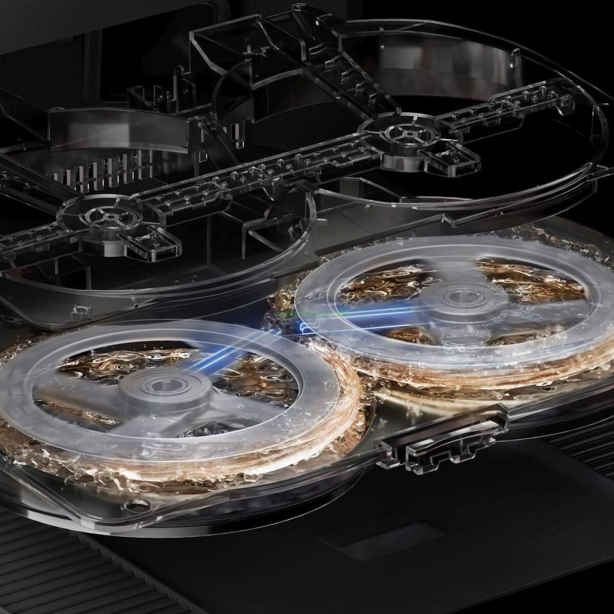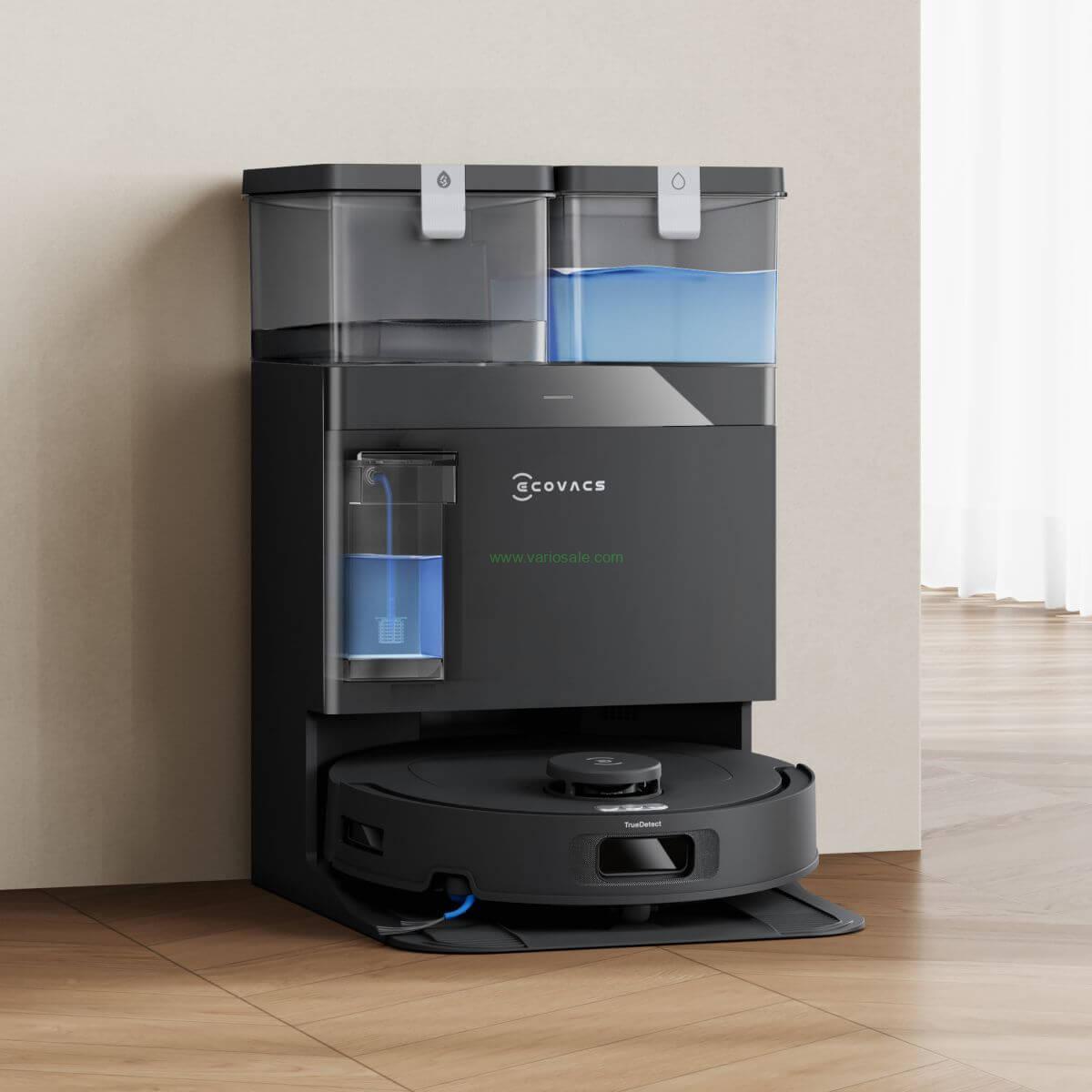 · All-in-one OMNI stanica umýva rotujúce mopy horúcou vodou s teplotou až 75 °C, vyžmýka ich a vysuší 45 °C teplým vzduchom. Zároveň automaticky vyprázdni prach zo zásobníka robotického vysávača a doplní mu vodu. Navyše do vody v presnom pomere nadávkuje čistiaci prostriedok.